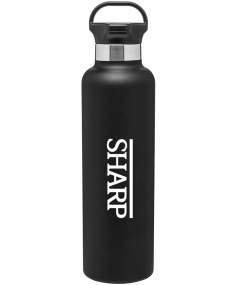 24 oz powder coated double wall 18/8 stainless steel thermal bottle with copper vacuum insulation, threaded gear-shaped insulated lid and carrying handle Complies with FDA, Prop 65. 11.25" H x 3" W