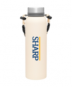 32 oz double wall 18/8 stainless steel thermal bottle with copper vacuum insulation, insulated stainless steel threaded lid, silicone ring, removable strap with buckles, removable clasps, and powder coated finish. Individual gift box. Hand wash recommended. Do not microwave. Complies with FDA, Prop 65. 11" H x 3.1875" W